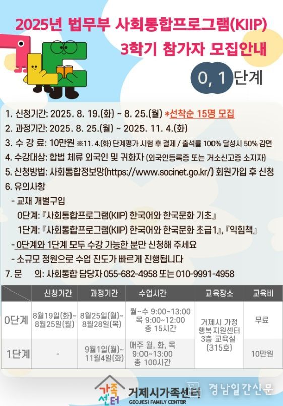 경남일간신문 | 거제시가족센터(센터장 류주진)는 법무부 주관 ‘2025년도 사회통합프로그램(KIIP)’ 2학기 2단계와 5단계(기본) 과정을 성공적으로 마무리하고, 오는 8월 19일 화요일부터 3학기 수강생을 모집한다고 밝혔다.
