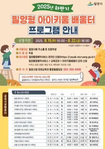 밀양시에 주소를 둔 아동이라면 누구나 무료로 참여할 수 있으며, 신청은 오는 19일부터 22일까지 밀양통합예약서비스에서 온라인으로 가능하다.