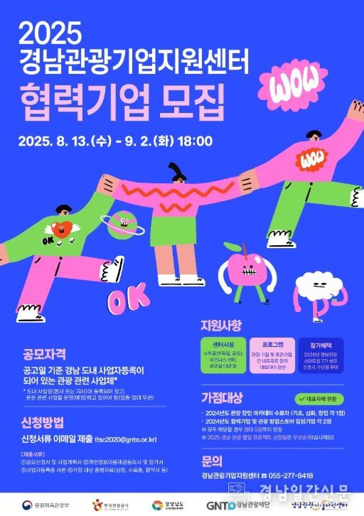 경남일간신문 | 경상남도는 8월 22일부터 오는 9월 2일까지 경남관광재단 관광기업지원센터 주관으로 도내 관광산업 생태계 활성화를 위해 ‘2025 경남관광기업지원센터 협력기업’ 8개 사 내외를 공개 모집한다고 밝혔다.