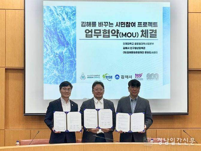 경남일간신문 | 김해시는 지난 13일 오후 2시 인제대학교 인당관에서 인제대 글로컬대학사업본부, 김해문화관광재단 김해문화도시센터와 ‘김해를 바꾸는 시민참여 프로젝트’ 추진을 위한 업무협약을 체결했다고 14일 밝혔다.