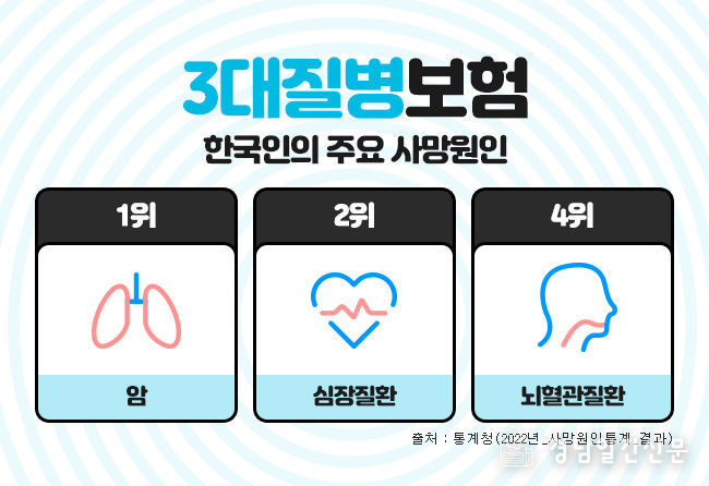 경남일간신문 | 3대질병으로 일컬어지는 암, 뇌혈관질환, 심혈관질환은 한국인의 주요 사망원인에서 상위를 차지하고 있으며, 이에 대한 진단비를 집중적으로 보장해 주는 보험상품을 3대질병진단비 보험이라 할 수 있다.