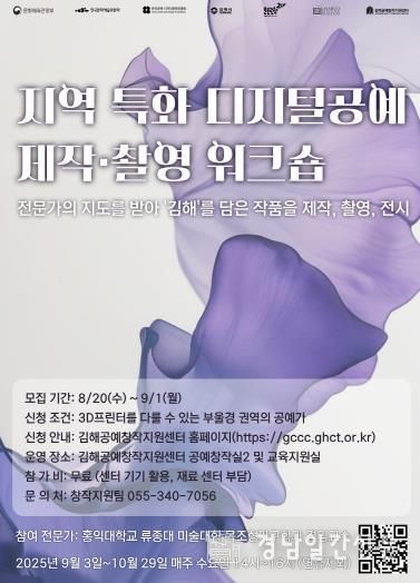 경남일간신문 | (재)김해문화관광재단 김해공예창작지원센터는 부울경 권역 공예인 10명을 대상으로, 지역 고유의 문화와 상징성을 디지털 기술로 재해석하는《지역 특화 디지털 공예 제작·촬영 워크숍》을 오는 9월 3일부터 10월 29일까지 운영한다.