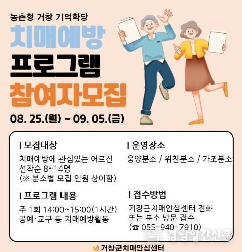경남일간신문 | 거창군 치매안심센터는 면 지역주민의 치매 예방 관리 접근성을 높이기 위해 농촌형 ‘거창 기억학당’(웅양·위천·가조 치매안심센터 분소) 3개소에서 하반기 치매예방 프로그램 참여자를 모집한다.