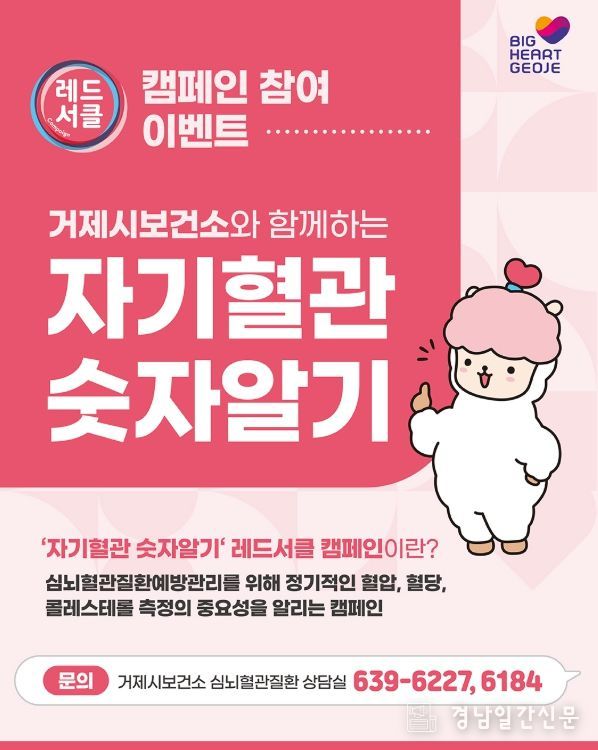 경남일간신문 | 거제시보건소는 심뇌혈관질환 예방관리 주간(9.1.~9.7.)을 맞아, 질병관리청-전국 지자체 합동으로 ‘자기혈관 숫자알기 – 레드서클 캠페인’을 운영한다.