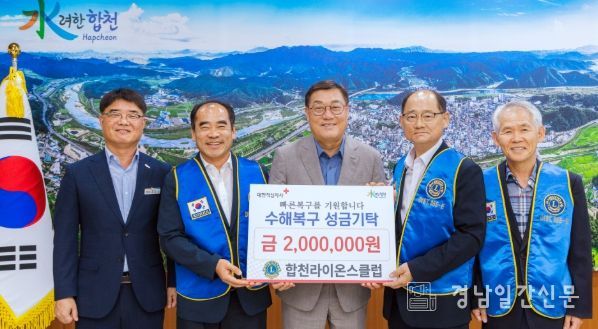 경남일간신문 | 합천라이온스클럽(국제라이온스협회 355-E지구 소속, 회장 정종락)은 최근 기록적인 집중호우로 큰 피해를 입은 합천군의 수해 복구를 지원하기 위해 성금 200만 원을 기탁했다.