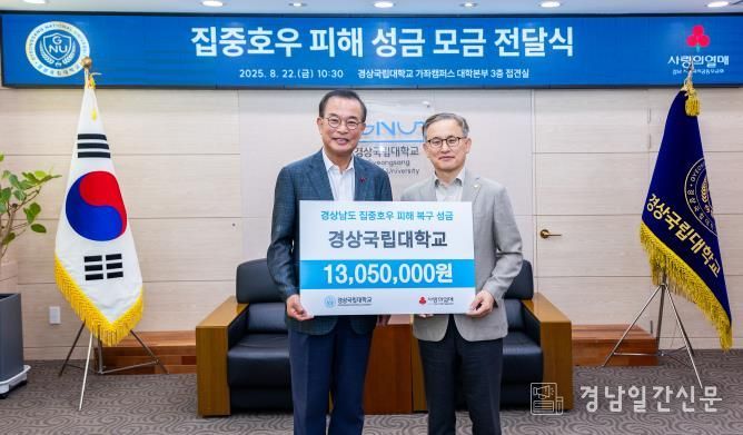 경남일간신문 | 경상국립대학교는 7월 16~20일 집중호우에 따른 수해 지역 및 이재민을 돕기 위한 성금 1305만 원을 경남사회복지공동모금회에 전달했다.