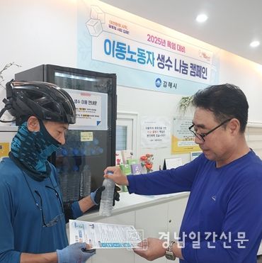 경남일간신문 | 김해시는 폭염 속에서 야외 근무가 많은 배달라이더, 택배기사, 대리운전기사, 방문학습지 교사 등 이동노동자들의 건강을 보호하기 위해 ‘폭염 대비 이동노동자 생수 나눔 캠페인’을 추진하고 있다고 26일 밝혔다.