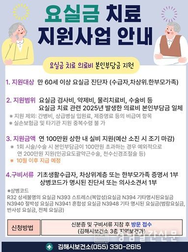 지원 대상은 김해시에 주소지를 둔 만 60세 이상 시민 중 기초생활수급자, 차상위계층으로 2025년에 발생한 검사비, 약제비, 물리치료비 등 본인부담금을 연 100만원, 수술비는 연 최대 200만원 한도 내에서 지원한다.