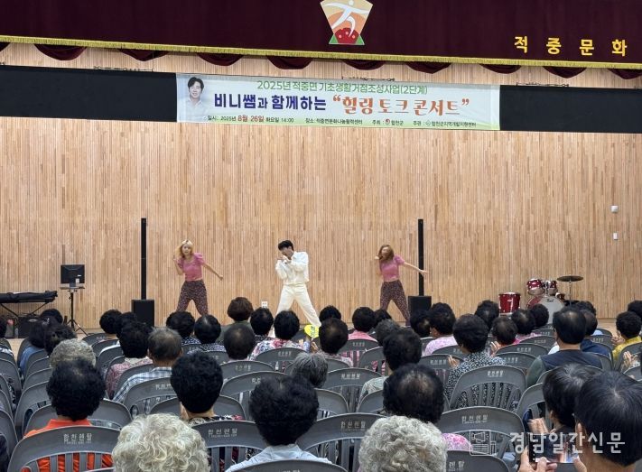 경남일간신문 | 합천군 적중면 문화나눔활력센터 운영위원회(위원장 정문식)는 26일 오후 2시, 문화나눔활력센터에서 ‘비니쌤과 함께하는 토크 힐링콘서트’를 개최했다. 주민 100여 명이 참석한 이번 행사는 일상 속에서 지친 마음을 치유하고, 더 행복한 삶을 살아가기 위한 지혜와 공감을 나누기 위해 마련됐다.