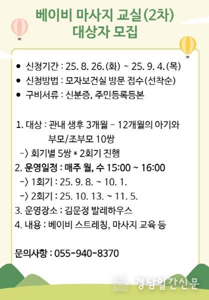 경남일간신문 | 거창군은 지난 26일부터 9월 4일까지 ‘베이비마사지교실(2차)’ 참여자를 모집한다고 밝혔다.