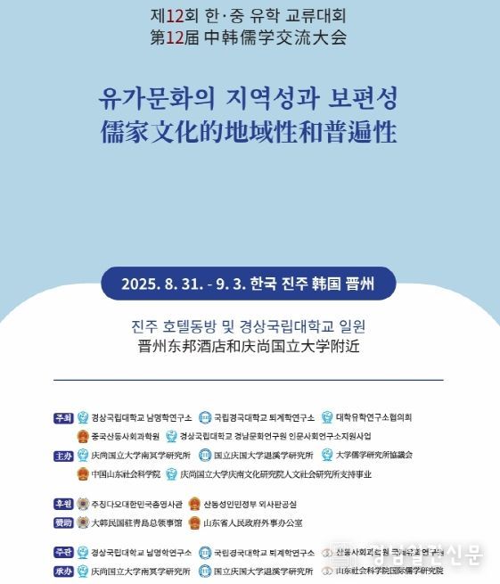 경남일간신문 | 경상국립대학교 경남문화연구원 남명학연구소(소장 강정화 한문학과 교수)는 9월 1~2일 진주와 산청 일원에서 ‘제12회 한‧중 유학 교류대회’를 개최한다.