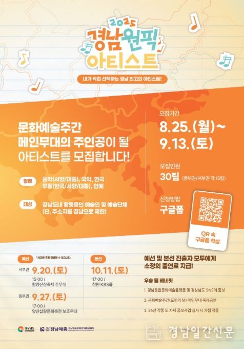 신청자 중 영상 심사를 통해 총 30개 팀이 1차로 선발되며, 이들은 지역 대표 축제와 연계된 예선 무대에 오른다. 서부권은 9월 20일 함양산삼축제, 동부권은 9월 27일 양산삽량문화대축전에서 예선이 열리며, 여기서 선발된 10개 팀은 10월 11일 ‘도민의 날’ 문화예술주간에 창원 KBS홀에서 열리는 결선 무대에 진출한다.