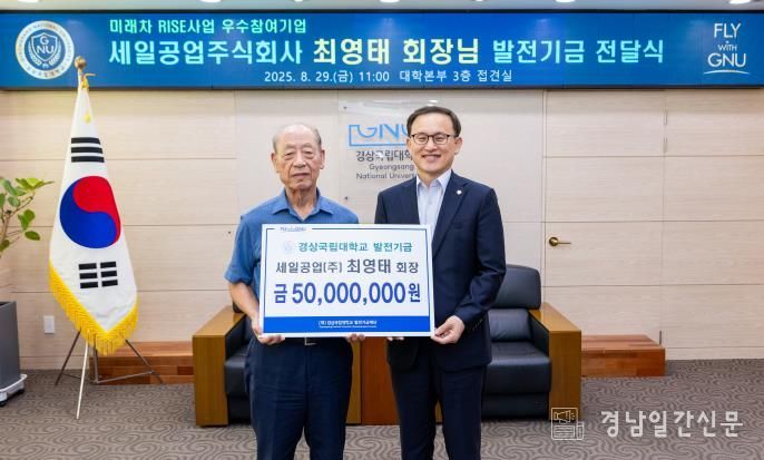 경남일간신문 | 경상국립대학교는 미래차 RISE사업 우수 참여기업인 세일공업(주)가 대학발전기금 5000만 원을 출연하기로 약정했다고 밝혔다.
