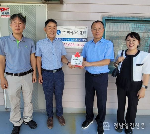 경남일간신문 | (재)김해시복지재단 서부노인종합복지관은 8월 29일, 김해시 지내동에 위치한 착한기업 231호점‘비에스이엔씨’를 방문해 현판 전달식을 가졌다.