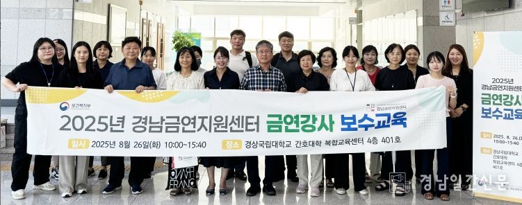 경남일간신문 | 경상국립대학교 산학협력단이 운영하는 경남금연지원센터는 8월 26일 칠암캠퍼스 간호대학 복합교육센터에서 센터 소속 금연강사들이 참석한 가운데 ‘2025년 경남금연지원센터 금연강사 보수교육’을 개최했다.
