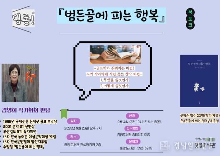 경남일간신문 | 양산시립 중앙도서관은 오는 9월 23일 오후 7시, '범든골에 피는 행복'의 저자 김영희 작가를 초청해 작가와의 만남 행사를 연다.