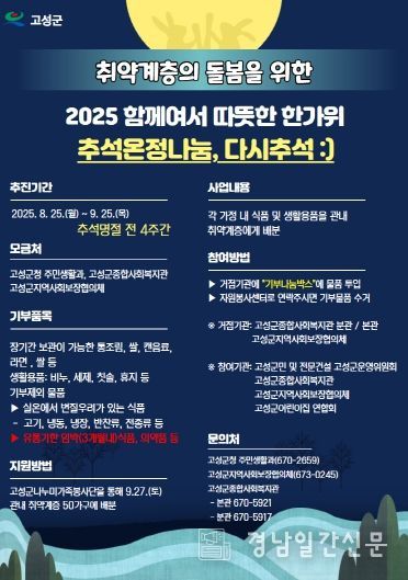 경남일간신문 | 고성군은 추석 명절을 앞두고 지역 내 소외된 이웃들에게 따뜻한 마음을 전하기 위한 “다시추석” 온정 나눔 운동을 추진한다.