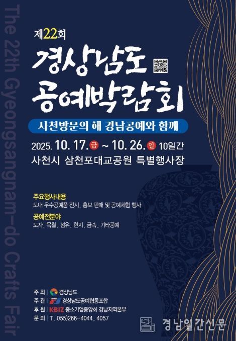 경남일간신문 | 경상남도는 오는 10월 17일부터 26일까지 사천시 삼천포대교공원 특별행사장에서 열리는 '제22회 경상남도 공예박람회'에 참여할 공예인을 9월 16일까지 공개 모집한다고 밝혔다.