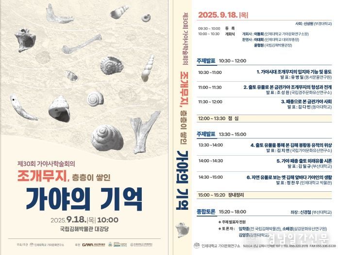 올해로 30회째를 맞는 가야사학술회의는 “조개무지, 층층이 쌓인 가야의 기억”이라는 주제로 가야인의 식생활과 생활의 흔적을 고스란히 알리는 자리이다