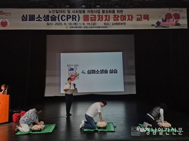 경남일간신문 | (재)김해시복지재단(대표이사 임주택)에서 운영 중인 김해시니어클럽(김해노인일자리창출지원센터)은 지난 18일부터 19일까지 양일에 걸쳐 노인역량활용사업 4개 사업단 참여자 400명을 대상으로 ‘심폐소생술(CPR) 응급처치 교육’을 성황리에 실시했다.