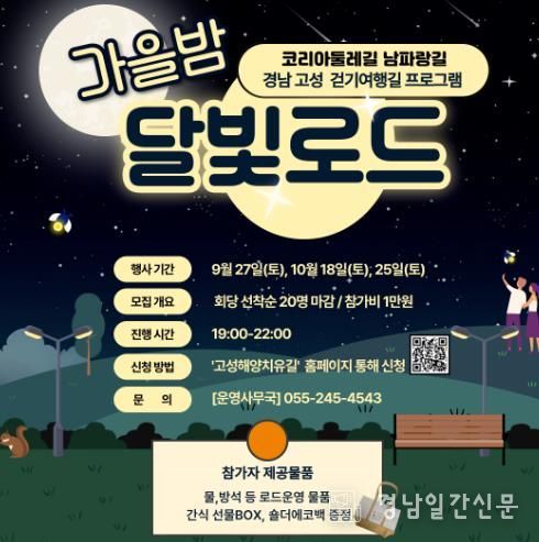 경남일간신문 | 고성군은 가을밤 시원한 바람이 불어오는 계절을 맞아 지역의 대표 야경 명소에서 특별한 치유 걷기 프로그램인 ‘달빛로드’를 운영한다고 밝혔다.