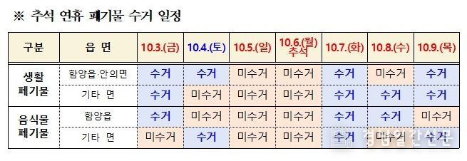 생활 쓰레기 수거 일정은 ▲3일 전 읍면 ▲4일 함양읍·안의면 ▲7일 전 읍면 ▲8일 함양읍·안의면 외 기타 면 ▲9일 전 읍면에서 정상 수거한다.