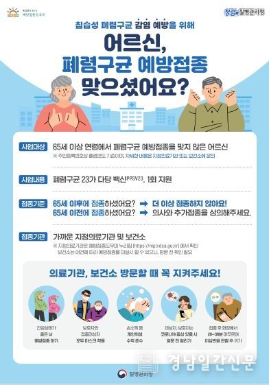 65세 이상 폐렴구균 예방접종 사업은 침습성 폐렴구균 감염증을 예방하기 위해 ‘폐렴구균 23가 다당백신(PPSV23)’을 평생 1회 무료 접종을 지원한다. 단, 65세 이상에서 폐렴구균 23가 다당백신(PPSV23)을 접종한 경우 추가 접종은 불필요하다.