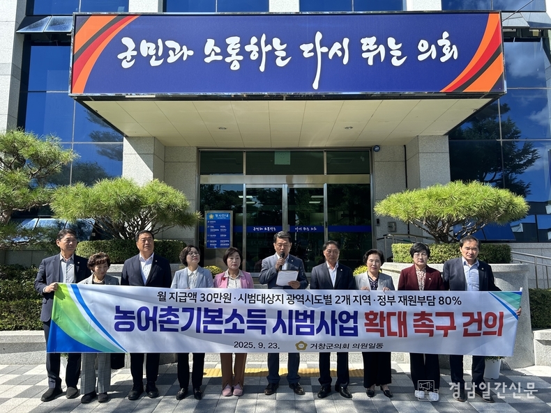 경남일간신문 | 23일 거창군의회(의장 이재운)는 정부가 추진 중인 ‘농어촌기본소득 시범사업’과 관련해 시범 대상 지역의 대폭 확대와 함께, 재원 분담 구조의 개선 및 지급액 상향 조정을 강력히 요구하는 건의문을 채택했다.