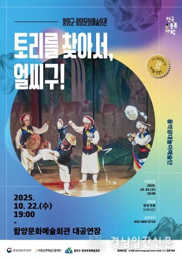 경남일간신문 | 함양군문화예술회관은 풍악광대놀이“토리를 찾아서, 얼씨구!”공연이 10월 22일 오후 7시 함양문화예술회관 대공연장에서 개최한다고 밝혔다.