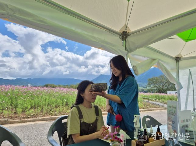 꽃단지 입구에서는 ‘치유on되는 여행지, 거창’을 주제로 치유프로그램 부스도 운영한다. 이 프로그램은 10월 12일까지 주말마다 진행되며, 거창군 공식 인스타그램 가조온천꽃단지 게시글에 ‘좋아요’와 댓글을 남긴 방문객은 아로마 향기 체험 등 치유프로그램을 즐길 수 있다.