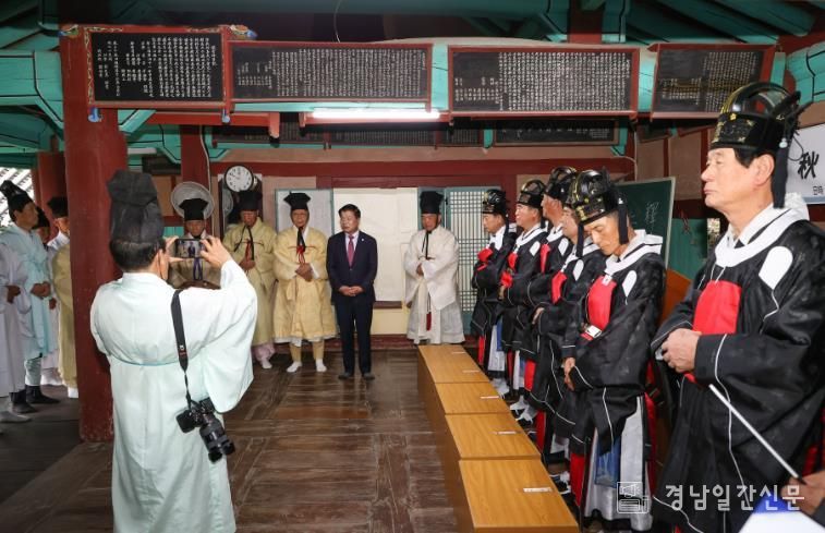 제례 봉행에는 △초헌관 이도경 삼도프레스 대표 △아헌관 이도생 고성향교 유림 △종헌관 한홍조 고성향교 유림이 참여해 관례에 따라 예복을 갖추고 성현들의 위패 앞에 헌작하며 공경을 표했다.
