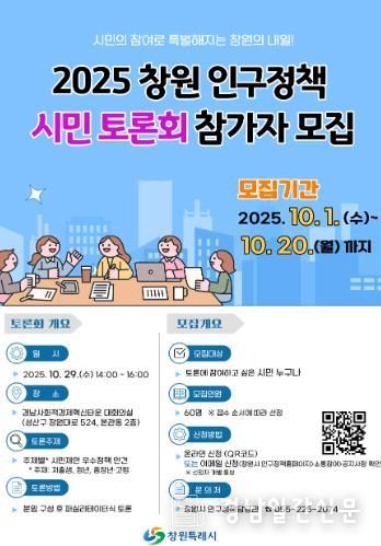 경남일간신문 | 창원특례시는 ‘시민이 제안한 인구정책을 시민이 직접 사업화 및 고도화 시킨다’는 취지로 오는 10월 29일 ‘2025 창원 인구정책 시민토론회’를 개최하고 이를 위해 10월 1일부터 20일까지 시민 토론참가자를 모집한다고 밝혔다.