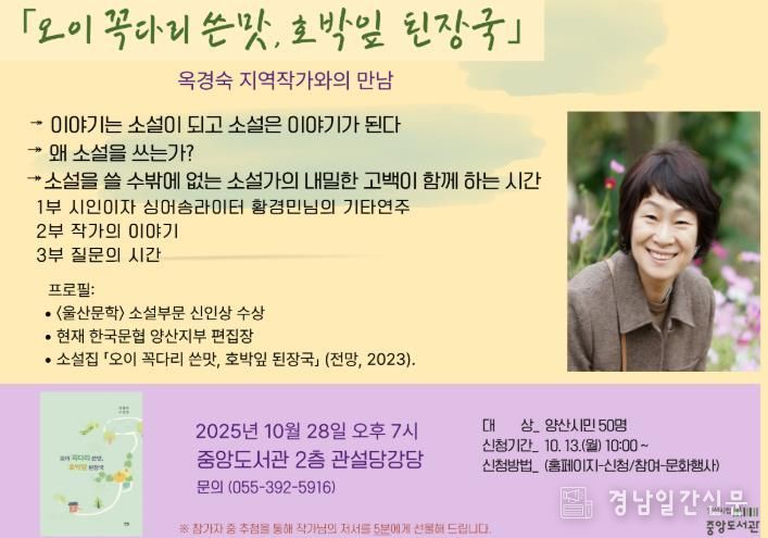 경남일간신문 | 양산시립 중앙도서관은 10월 28일 오후 7시 '오이 꼭다리 쓴맛, 호박잎 된장국'의 저자 옥경숙 작가를 초청해 작가와의 만남 행사를 개최한다.