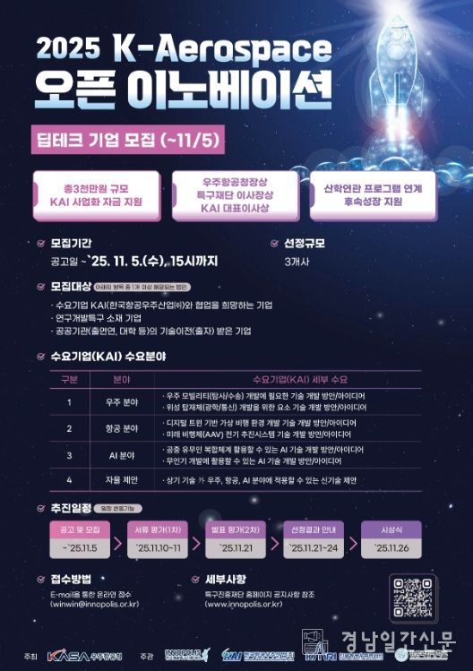 경남일간신문 | 경상국립대학교 경남진주강소특구지원센터는 한국항공우주산업㈜ 연구개발특구진흥재단, 한국항공우주연구원과 공동으로 ‘2025 K-항공우주(Aerospace) 오픈 이노베이션’을 추진한다.