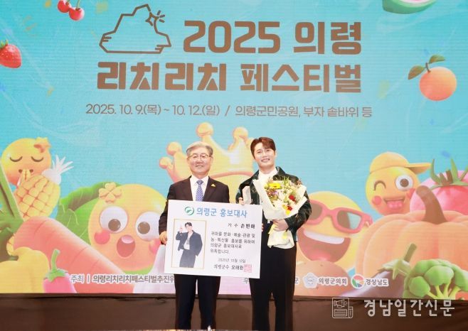 손 씨는 지난 12일 열린 리치리치페스티벌 ‘토요애 화합콘서트’ 무대에서 오태완 의령군수로부터 홍보대사 위촉패를 전달받고, 축하 공연을 펼쳤다. 특히 이날 의령 발전을 위한 고향사랑기부금 500만 원을 기부해 큰 박수를 받았다.