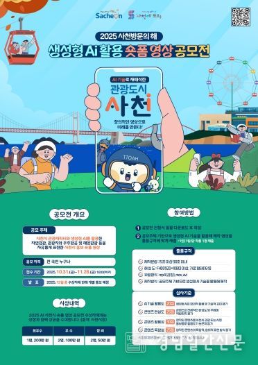 경남일간신문 | 사천시는 2025 사천방문의 해를 맞아 시의 관광자원과 관광 캐릭터에 대한 관심과 인지도를 제고하기 위한 생성형 AI 활용 숏폼 영상 공모전을 10월 31일부터 11월 28일까지 개최한다.