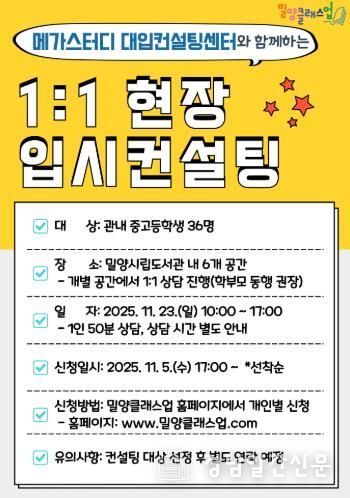 경남일간신문 | 경남 밀양시는 오는 23일 일요일 오전 10시부터 밀양시립도서관에서 ‘메가스터디 대입컨설팅센터와 함께하는 1:1 현장 입시컨설팅’을 개최한다고 3일 밝혔다.