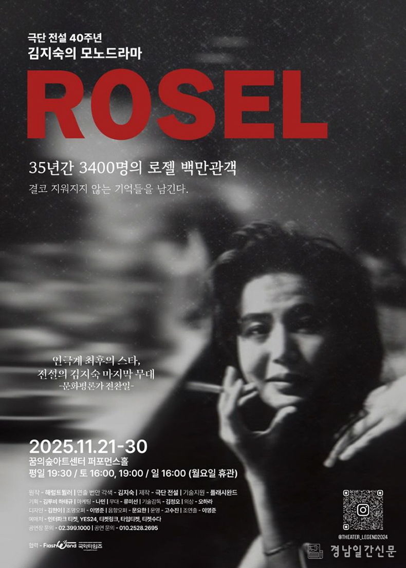 경남일간신문 | 극단 전설 40주년 기념작이자 배우 김지숙의 마지막 공연인 모노드라마 〈로젤〉이 오는 11월 21일부터 30일까지 꿈의숲아트센터 퍼포먼스홀에서 막을 올린다. 35년간 3,400회 이상 공연되며 백만 명이 넘는 관객을 울린 이 작품은 여성의 주체성과 인간성의 회복을 그린 한국 연극사의 대표작으로 꼽힌다.