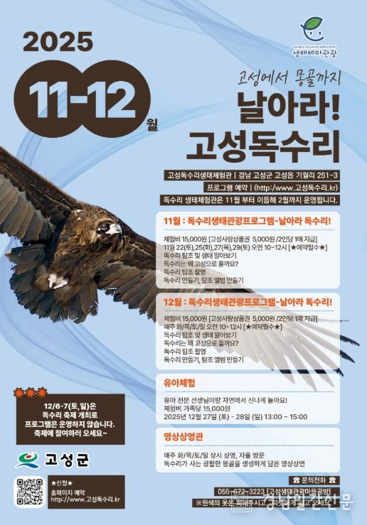 독수리 생태체험 프로그램 내년 2월까지 매주 화요일, 목요일, 토요일 오전 10시부터 12시까지 운영되며, 고성 독수리 누리집을 통해 사전예약 후 참여할 수 있다.