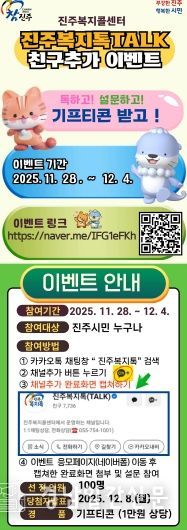 이벤트 응모 방법은 ‘진주복지톡’ 채널에 친구를 추가한 뒤, 채널 추가 인증사진을 응모 페이지에서 등록하고, 설문을 작성하는 방식이다. 이벤트 참여자를 무작위 추첨해 기프티콘(1만 원 상당)을 증정하며, 당첨자는 12월 8일 발표할 예정이다.