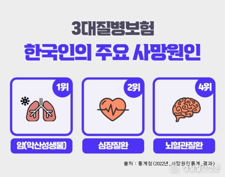 경남일간신문 | 흔히 3대질병이라 일컫는 암, 심혈관질환, 뇌혈관질환은 통계청 발표자료에 따르면 한국인의 주요 사망원인 중에서 3위 폐렴을 제외하고 1~4위를 차지하고 있으며, 이전부터 지금까지도 살면서 가장 먼저 대비해야 하는 치명적인 질병으로 강조되고 있다. 이러한 중대질병에 대비하기 위하여 상기 세가지 치명적인 질병을 집중보장하는 3대질병진단비보험을 많이 가입하고 있다. 3대진단비보험은 각각의 질병을 중점적으로 보장하면서도 가입자 특성에 맞는 특약을 추가함으로써 종합건강보험으로도 활용할 수가 있다.