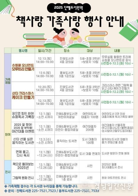 경남일간신문 | 창원특례시 진해도서관과는 연말을 맞아 가족과 함께 즐길 수 있는 따뜻하고 풍성한 ‘2025 책사랑 가족사랑 행사’를 진해도서관 및 동부도서관에서 12월 한 달간 운영한다.