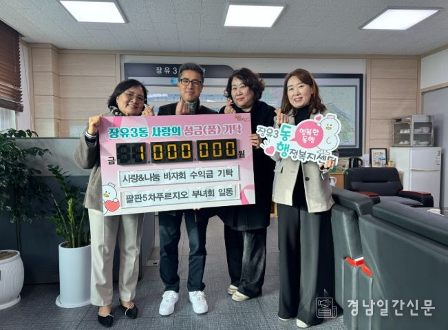 팔판마을5차푸르지오아파트 부녀회(회장 송정옥)는 19일, 장유3동 행정복지센터에서 ‘사랑&나눔 바자회’ 수익금 1백만원을 전달하는 성금 기탁식을 가졌다.
