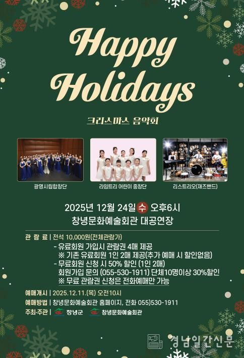 경남일간신문 | 창녕군은 오는 24일 오후 6시 창녕문화예술회관 대공연장에서 온 가족이 함께 즐길 수 있는 기획공연 ‘크리스마스 음악회’를 개최한다고 밝혔다.