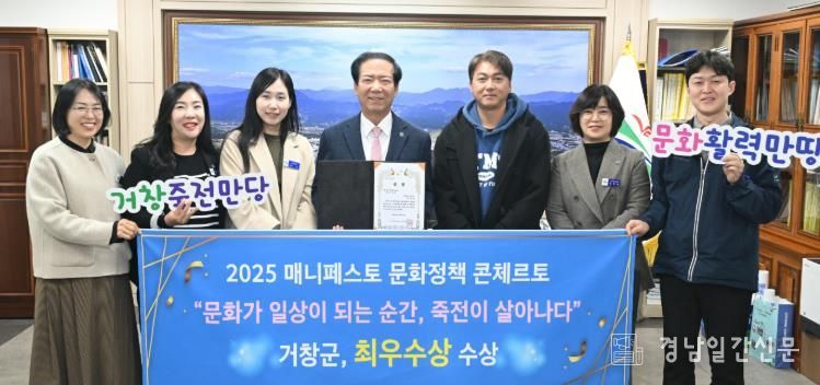 경남일간신문 | 거창군은 강원특별자치도 원주시 상지대학교에서 개최한 ‘2025 전국 기초단체장 매니페스토 문화정책 콘체르토(Concerto)’ 대회에서 문화기반 도시활력분야 ‘최우수상’을 수상했다고 26일 밝혔다.