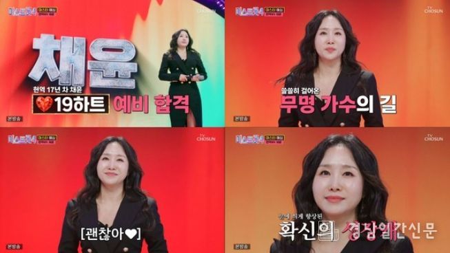 이날 방송에서 채윤은 이은하 원곡의 ‘겨울 장미’를 열창했다. 특유의 짙은 음색과 세월이 묻어나는 감정 표현으로 마스터 심사위원들은 물론, 시청자들의 마음까지 울리며 깊은 여운을 남겼다. 그 결과 채윤은 총 19하트를 받으며 예비 합격자가 됐다.