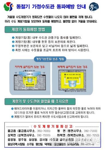 동파로 인한 급수 중단을 최소화하기 위한 긴급 대응체계가 구축돼 있으며, 동파가 발생할 경우, 각 읍면별 담당부서를 통해 즉시 조치를 취할 예정이며 아래의 연락처를 통해 신속히 피해신고를 할 수 있다.