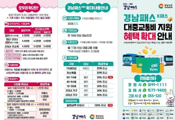 이번 K-패스(경남패스) 혜택 확대와 관광형 하모콜버스 운영방식 개선을 통해 청년과 고령층 등 대중교통 실수요자의 교통비 부담이 완화되고, 대중교통의 이용 활성화와 관광객의 이동 편의증진이 기대된다.