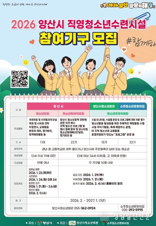 신청방법은 접속하여 네이버 폼 양식을 제출하여 신청하면 된다. 2026 양산시 직영 청소년수련시설 청소년참여기구는 양산시가 주최하며, 양산시청소년회관과 소주청소년문화의집 주관으로 진행된다.