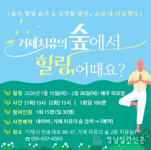 경남일간신문 | 거제 치유의 숲이 2026년 새해를 맞아 ‘숲속 힐링 요가 & 싱잉볼 명상으로 내 마음챙김’을 운영한다.